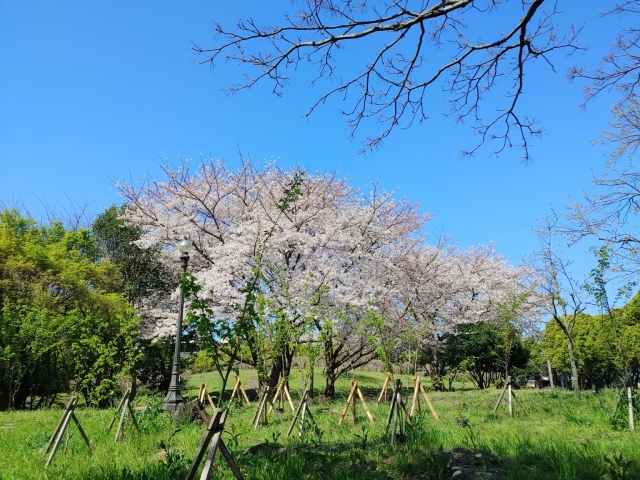 広い芝生と桜並木があり、ピクニックをしながら桜を楽しめます。
